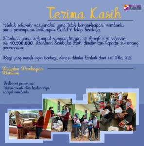 Partisipasi dari masayarakat untuk perempuan yang terdampak Covid – 19 sudah terkumpul sebesar Rp. 10.500.000 yang sudah di salurkan kepada 204 orang perempuan yang terdampak Covid – 19. Yang masing mau berbagi masih ada waktu dari 1 – 15 Mei 2020.